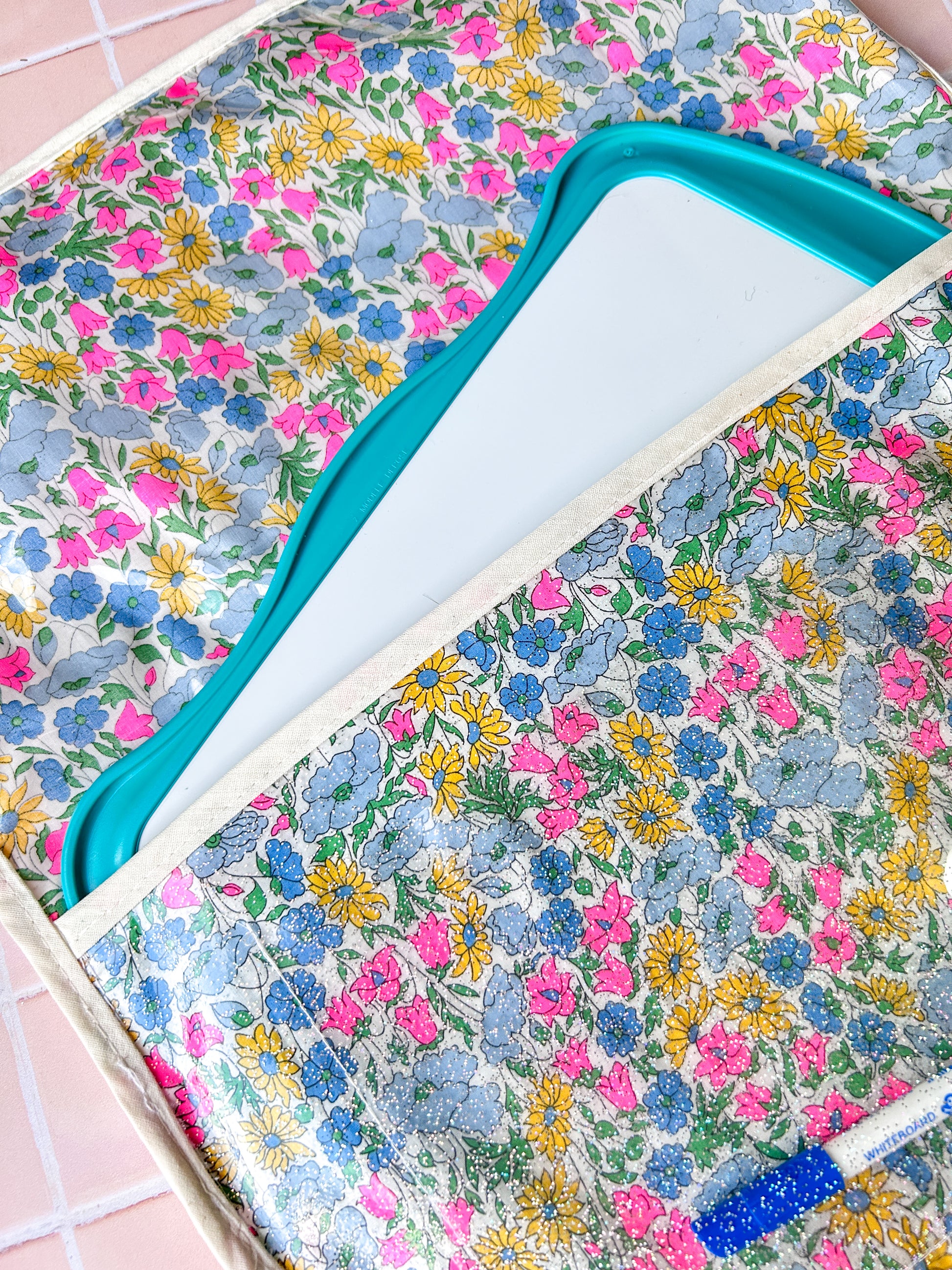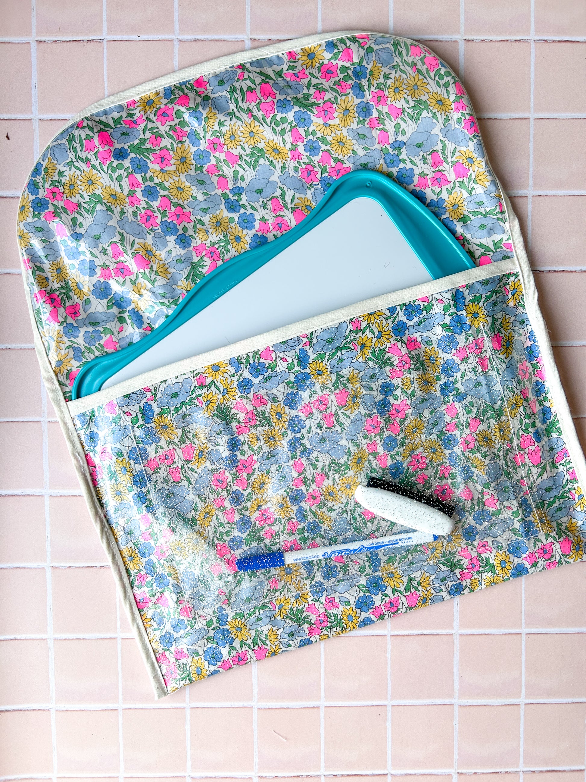 Réalisé dans un tissu Liberty enduit au look fleuri et coloré, il protège l’ardoise, les feutres et l’éponge tout en ajoutant une touche de peps au cartable. Grâce à sa fermeture par bande élastique et ses deux grandes poches intérieures, tout reste bien en place.