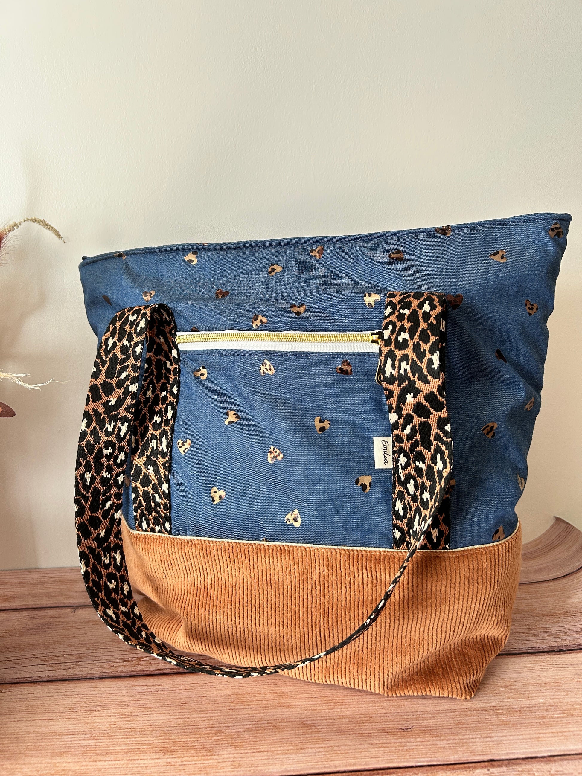 Confectionné dans un tissu jean bleu imprimé de petits cœurs effet léopard et un velours côtelé camel au toucher doux et rétro, ce cabas séduit par son design unique. Ses anses en sangle motif léopard apportent une touche mode et tendance, tout en offrant un port agréable à l’épaule.