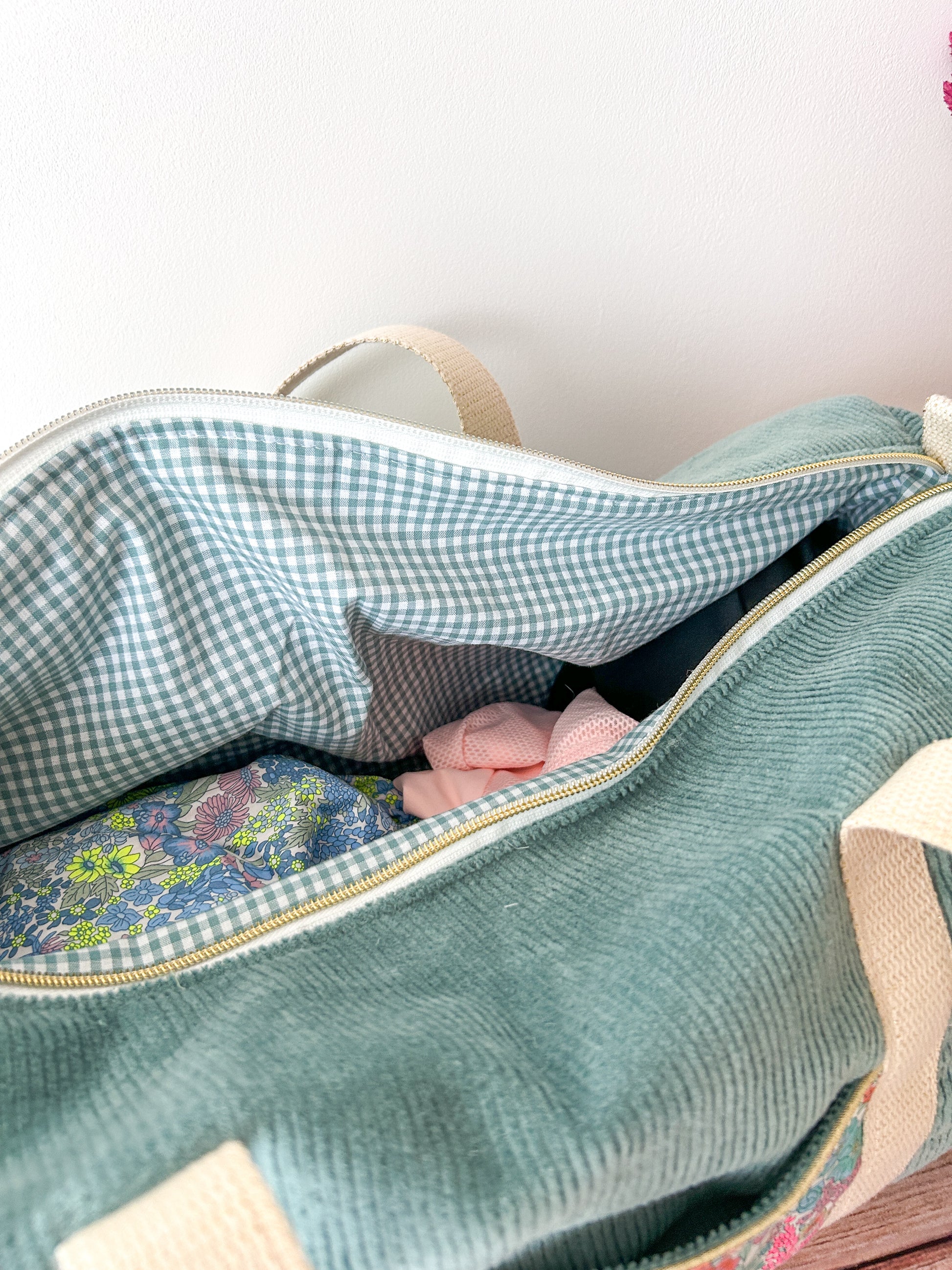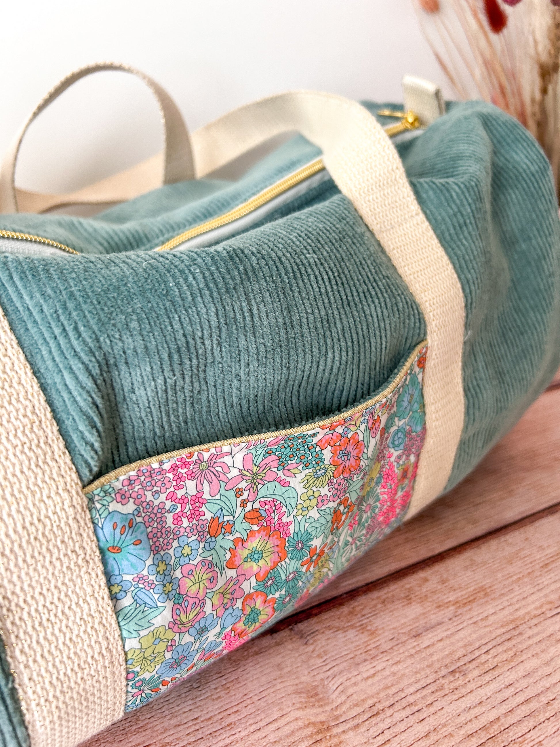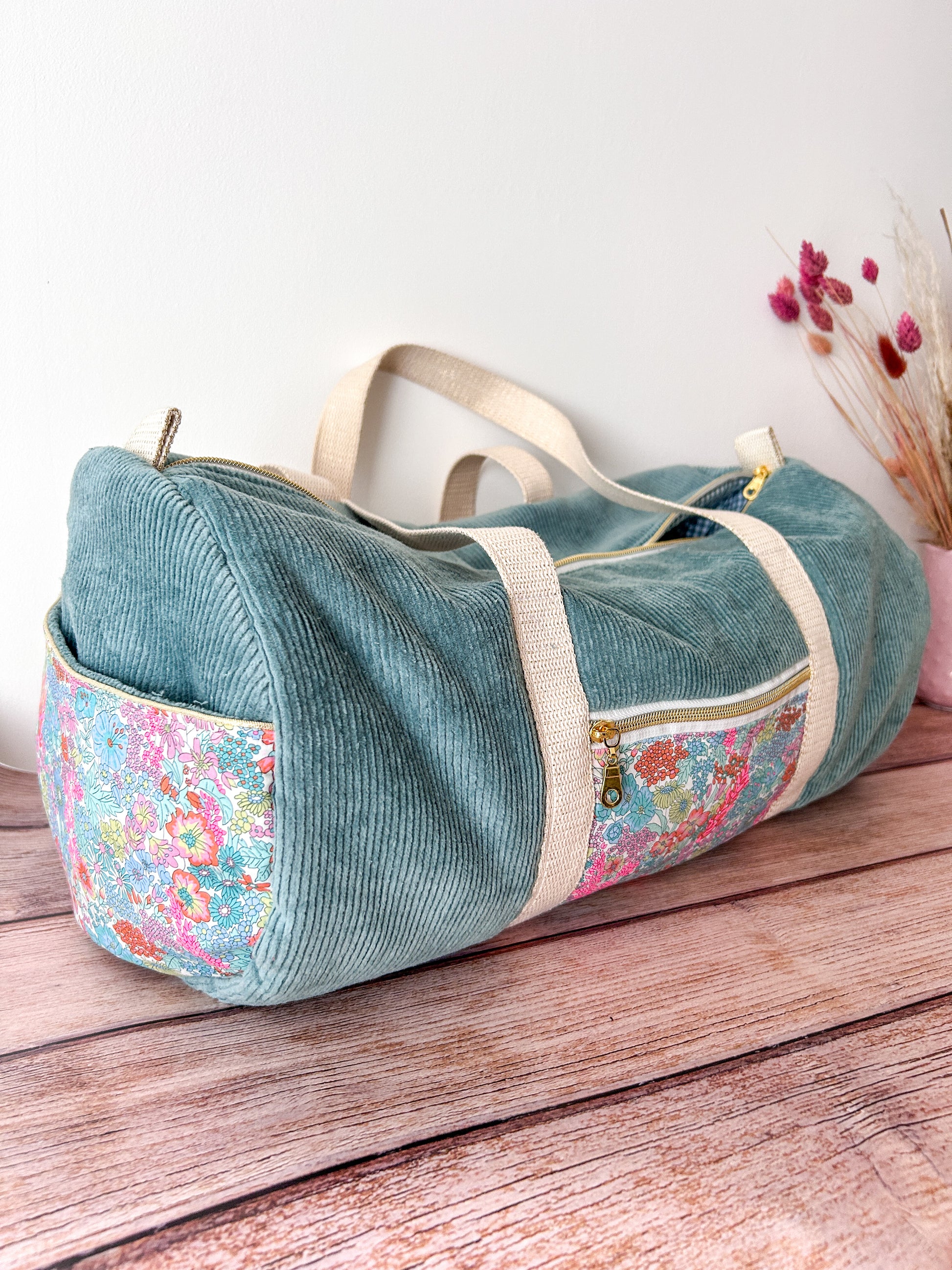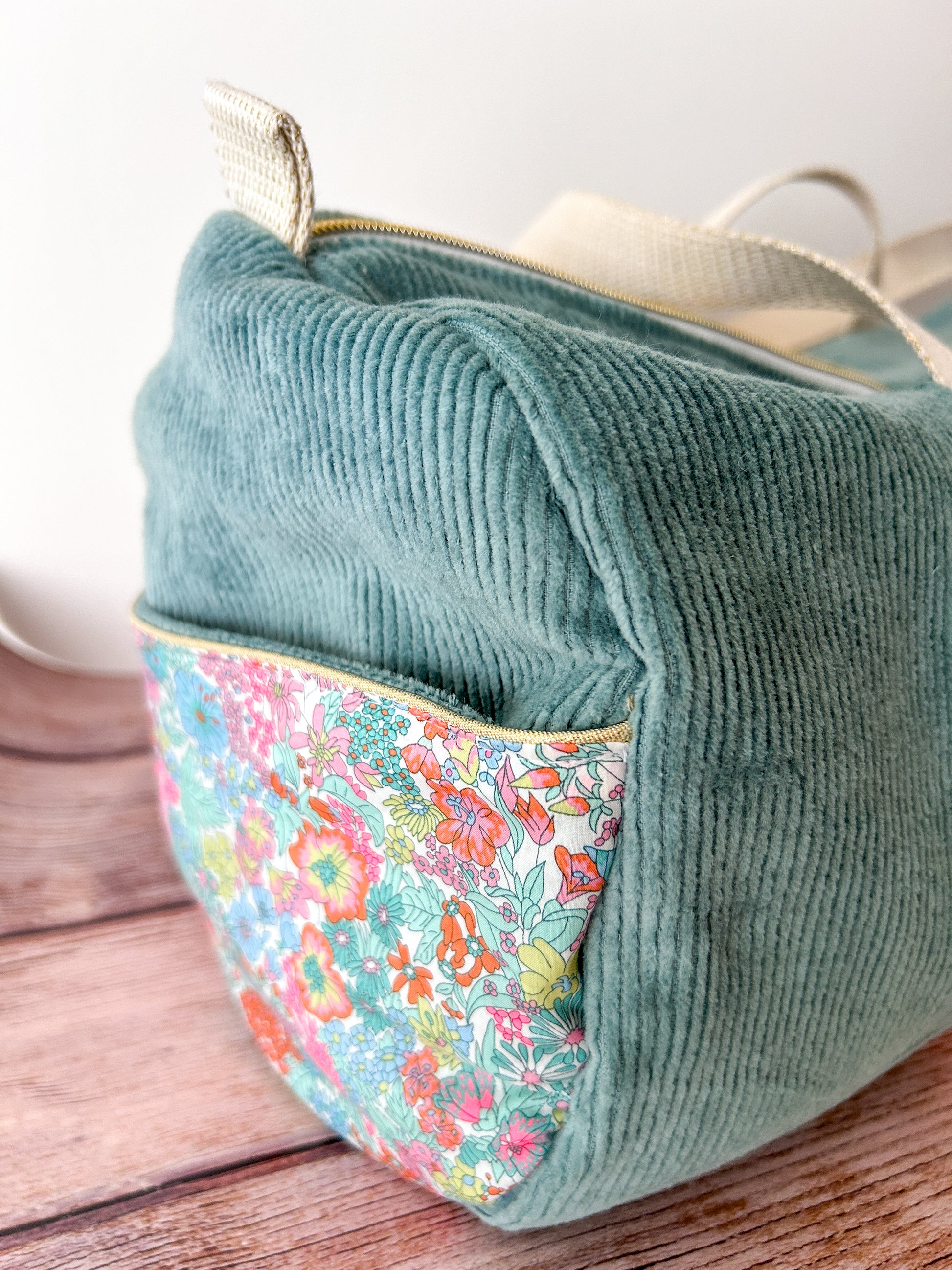 Sac bowling en velours côtelé et Liberty, pratique et chic à la fois. Avec ses multiples poches, il s’adapte à toutes vos envies : sac de sport, sac à langer ou sac du quotidien. Intérieur vichy, doublé de ouate pour une tenue parfaite. Personnalisable avec une broderie prénom.