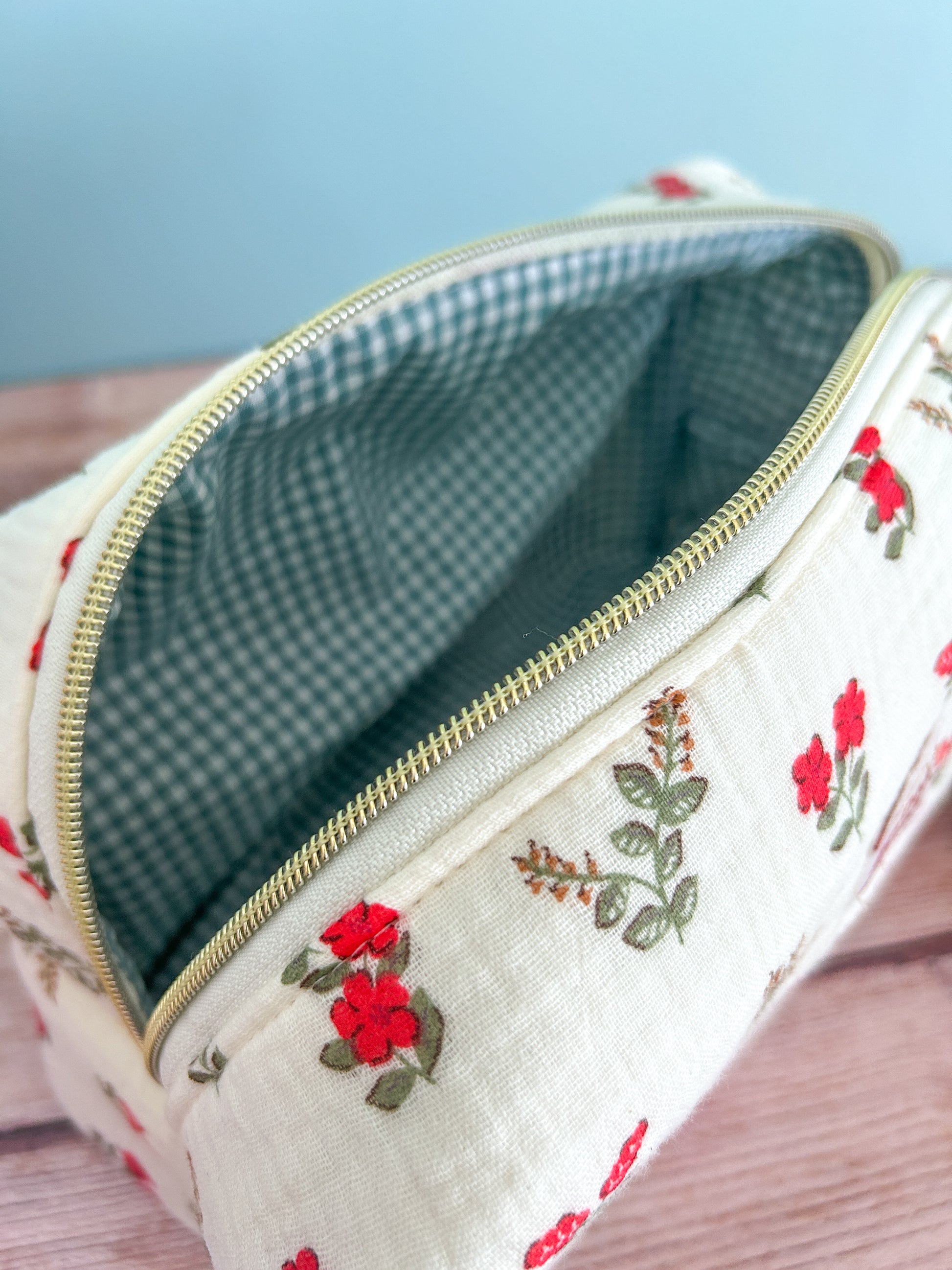 Apportez une touche de douceur et de fraîcheur à votre quotidien avec cette jolie trousse fleurie, confectionnée dans une double gaze de coton au motif délicat de petites fleurs rouges.