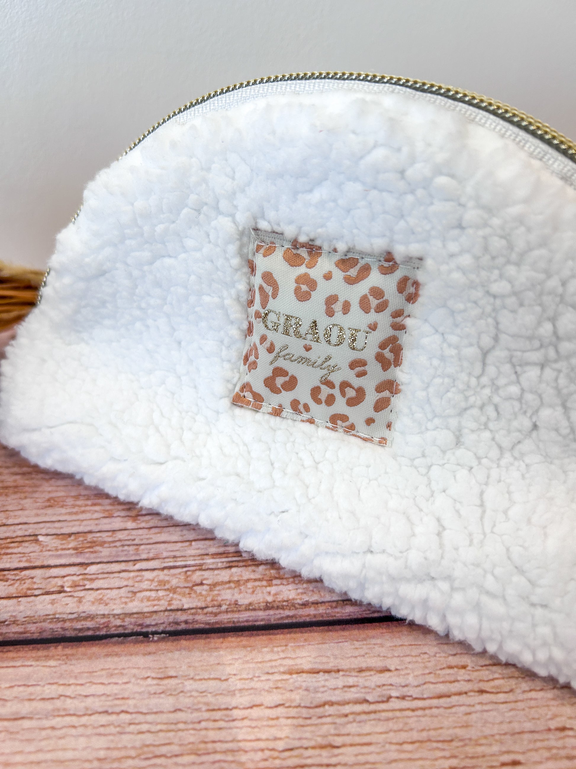 Douce, tendance et pleine de caractère, cette trousse en tissu moumoute blanche est doublée d’un imprimé léopard pour une touche audacieuse. Son joli nœud au fermoir et sa forme arrondie en font un accessoire aussi chic que pratique.